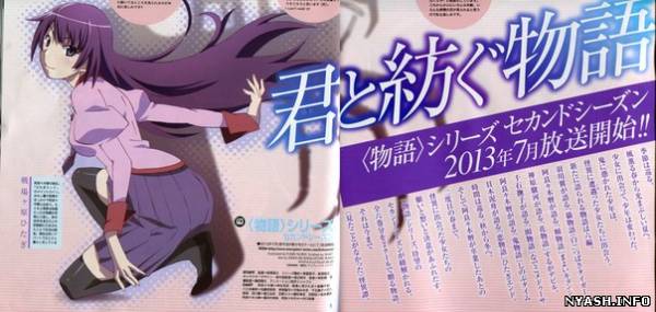 Февральский выпуск журнала Newtype обнародовал подробности "2 сезона" серии "Monogatari". Как и планировалось, аниме охватит 6 книг (Nekomogatari (Shiro), Kabukimonogatari, Hanamonogatari, Otorimonogatari, Onimonogatari и Koimonogatari) и будет транслироваться в течении полугода. Премьерный показ намечен на Июль 2013.