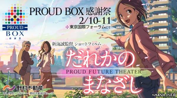 ![]() Представляю вам трейлер, анонсированной ранее короткометражки 'Dareka no Manazashi' от легендарного Макото Синкая. Премьерный показ пройдет на эвенте "Proud Box Kanshasai" 10 Февраля. Сюжет короткометражки разворачивается в недалеком будущем и повествует о работящей девушке по имени Ая "Аа-чан" Окамура, а так же ее семье. | |